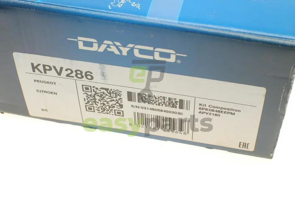 Купить DAYCO KPV286 Комплект ременя генератора Citroen Berlingo 1.6 HDI 08- (6PK848EEPM+APV2180) с быстрой доставкой, или удобным самовывозом, по доступной цене