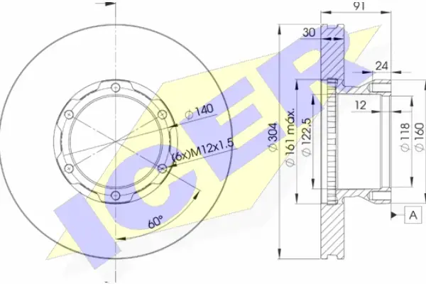 Диск гальмівний (передній) MB 609/Vario 512 16" (304х30) (вентильований) ICER 78BD4240-1