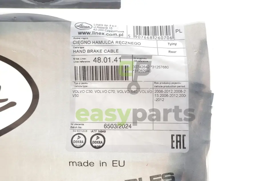 Трос ручника (задній) Volvo C30/C70/S40/V50 03-13 (1816/1860mm) LINEX 480141