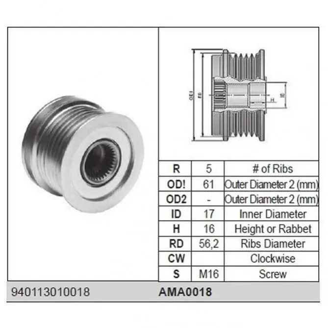 Ремінний шків генератора (17x55)MERCEDES BENZ [940113010018] MAGNETI MARELLI (Магнети Марелли) AMA0018