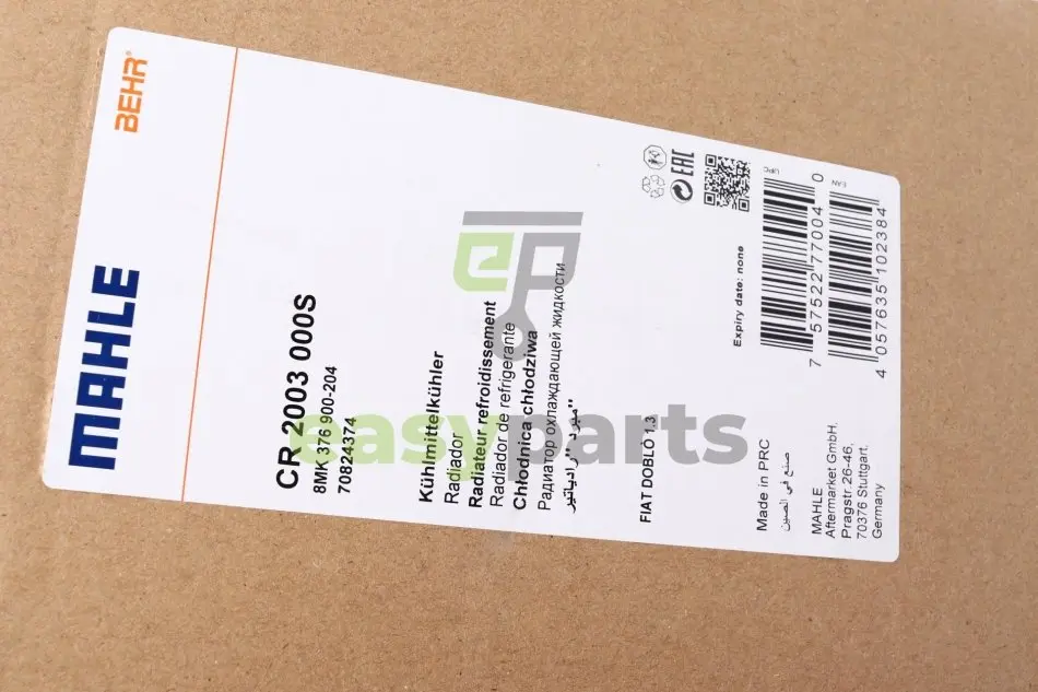 Радіатор охолодження двигуна Fiat Doblo 1.3D/1.4 10- (388x620x16) MAHLE / KNECHT CR 2003 000S