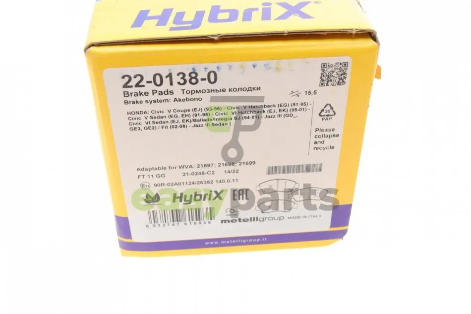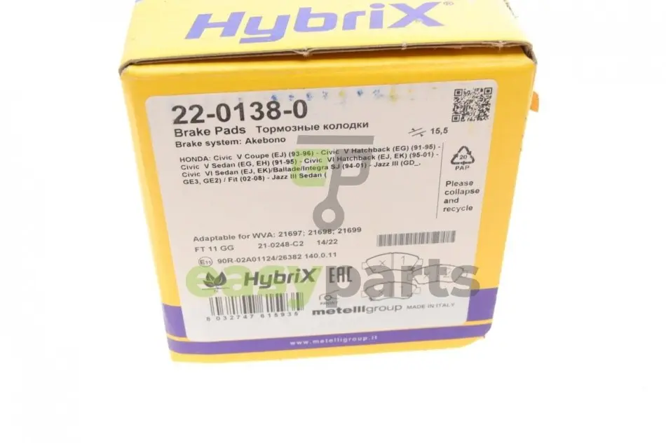 Колодки гальмівні (передні) Honda Civic V/VI 91-01/VIII 10-12/Jazz 02- Metelli (Метелли) 22-0138-0