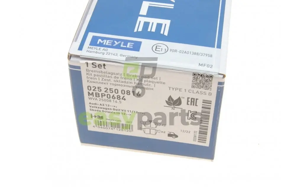 Колодки гальмівні (задні) Audi A3/VW Golf 12-/Touran/Passat B8 14-/Skoda Karoq 17-/Octavia 20- MEYLE (Мейли) 025 250 0816