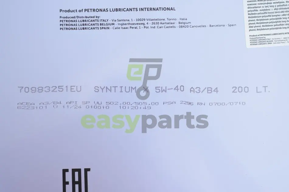 Олива 5W40 SYNTIUM X ACEA A3/B4 (200L) (VW502 00/505 00/RN0700/0710/PSA 2296) Petronas 70983251EU