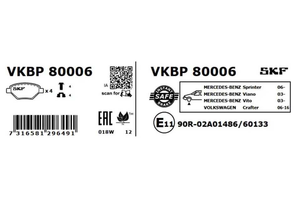 Комплект тормозных колодок, дисковый тормоз SKF (СКФ) VKBP 80006