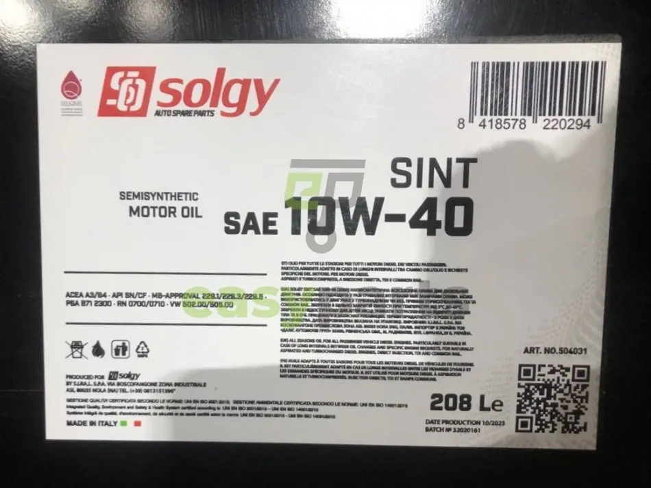 Олива 10W40 SINT (208L) (SN/CF/A3/B4/MB 229.5/MB 229.1/MB 229.3/VW 502.00/VW 505.00/RN0700/RN0710) Solgy 504031