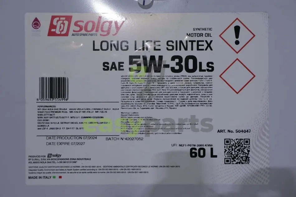 Олива 5W30 LONG LIFE SINTEX LS (60L) (MAN M3477/MB 235.28/Volvo VDS-4/VDS-3/RENAULT RLD-3/RLD-4) Solgy 504047