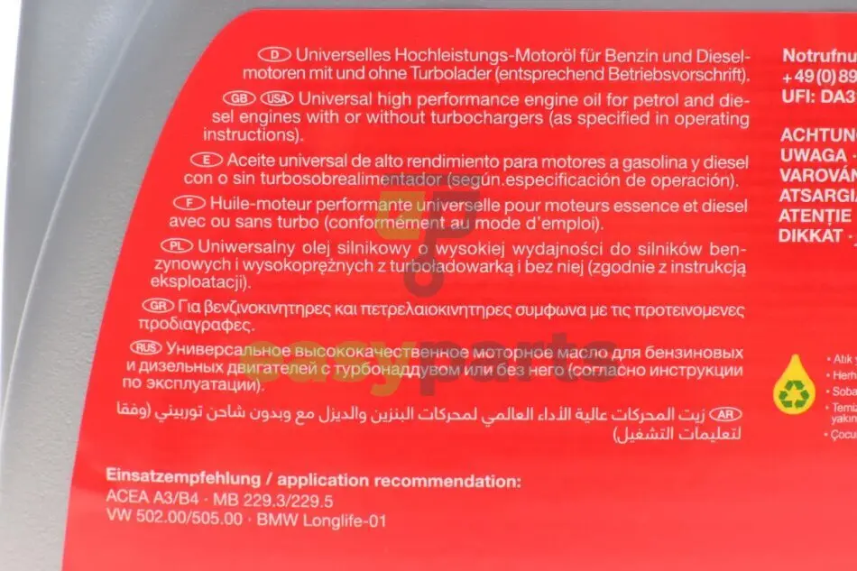 Дозвіл виробника: BMW LL-01, MB-229.5, PORSCHE A40, PSA B71 2296, RENAULT RN0700, RENAULT RN0710, VW 502, VW 505