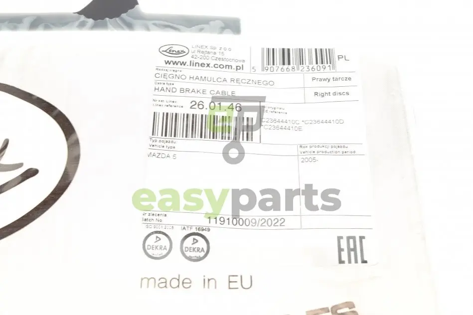 Трос ручника (задній) (R) Mazda 5 05- (1810/1680mm) LINEX 26.01.46