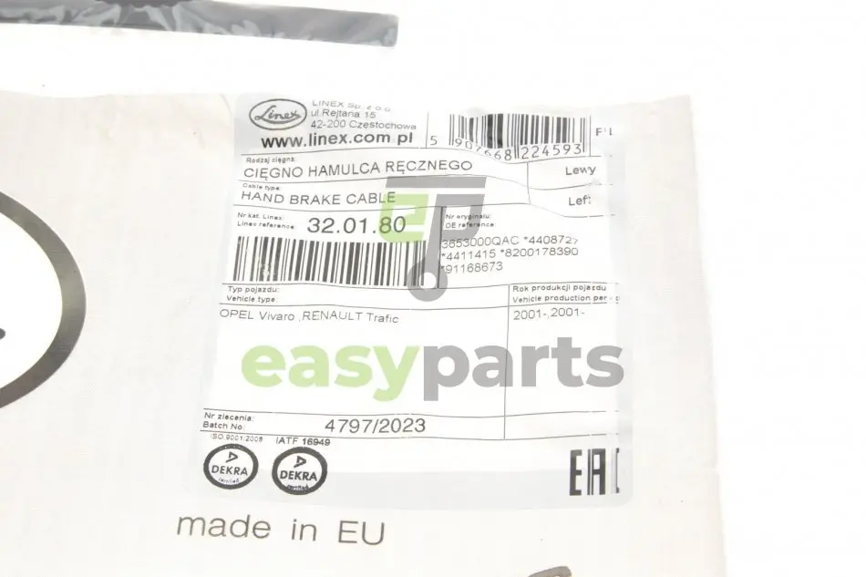 Трос ручника (L) Renault Trafic/Opel Vivaro 01-02 (1603/1465 мм) LINEX 320180
