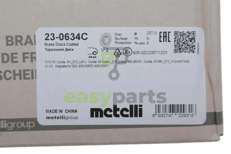Диск гальмівний (задній) Toyota Corolla 02-13 (258x9) (з покриттям) (повний) Metelli (Метеллі) 230634C