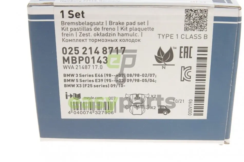 Колодки гальмівні (задні) BMW 3 (E46)/5 (E39)/7 (E38)/X3 (E83)/X5 (E53) 94- MEYLE (Мейлі) 0252148717