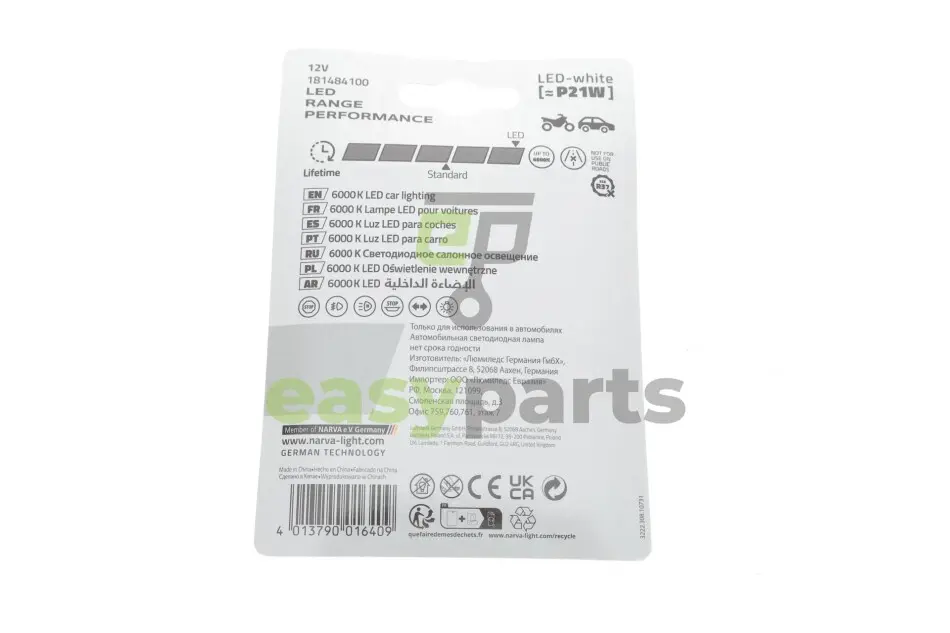 Автолампа P21W 12V 2.2W BA15s LED (біла) (к-кт 2 шт.) NARVA (Нарва) 181484100