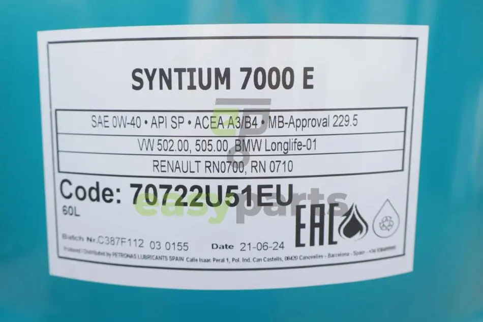Олива 0W40 SYNTIUM 7000 E (60L) (MB 229.5/MB 229.3/VW 502.00/505.00/LL-01/RN0710/Ford WSS-M2C937-A) Petronas 70722U51EU