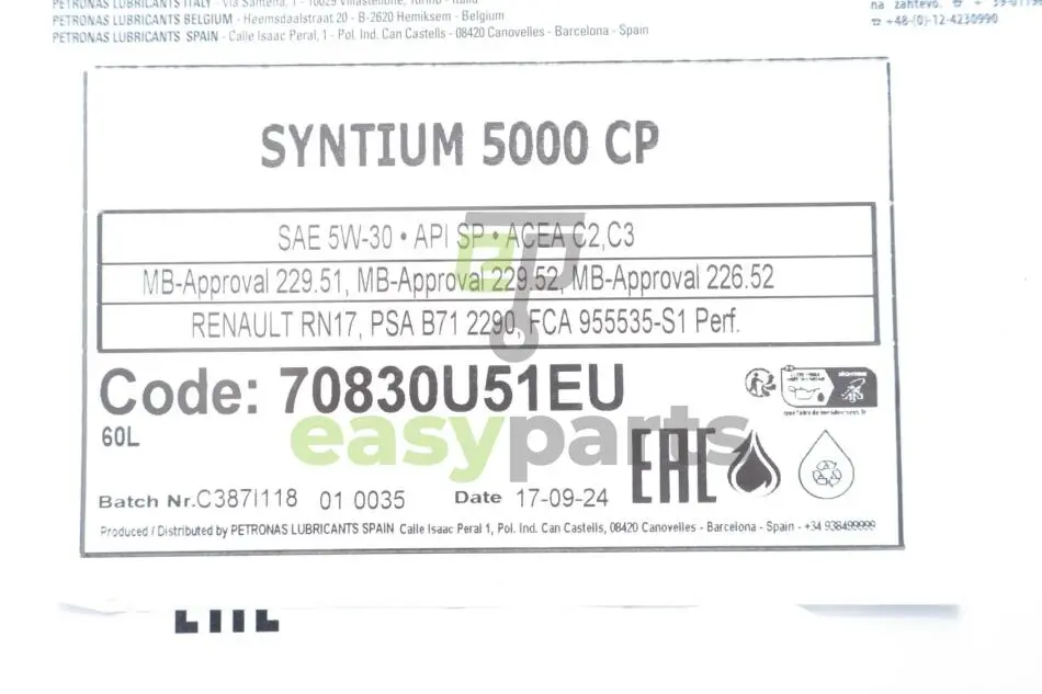Олива 5W30 SYNTIUM 5000 CP (60L) (MB229.51/MB229.52/MB226.52/Renault RN17/PSA B71 2290) Petronas 70830U51EU