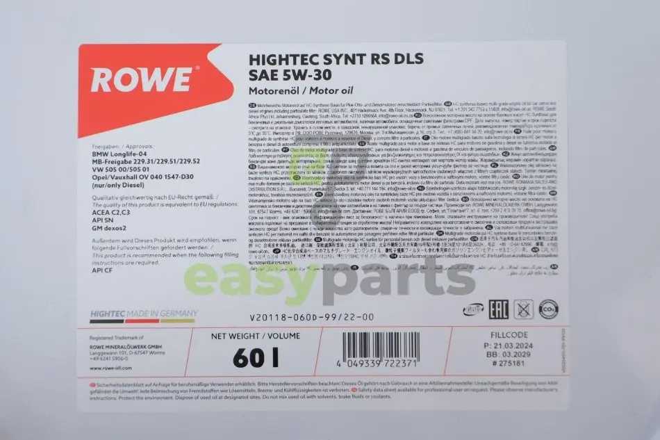 Олива 5W30 HIGHTEC SYNT RS DLS (60L) (MB 229.31/229.51/MB 229.52/BMW LL-04) ACEA C2,C3/API SN ROWE 20118-060D-99