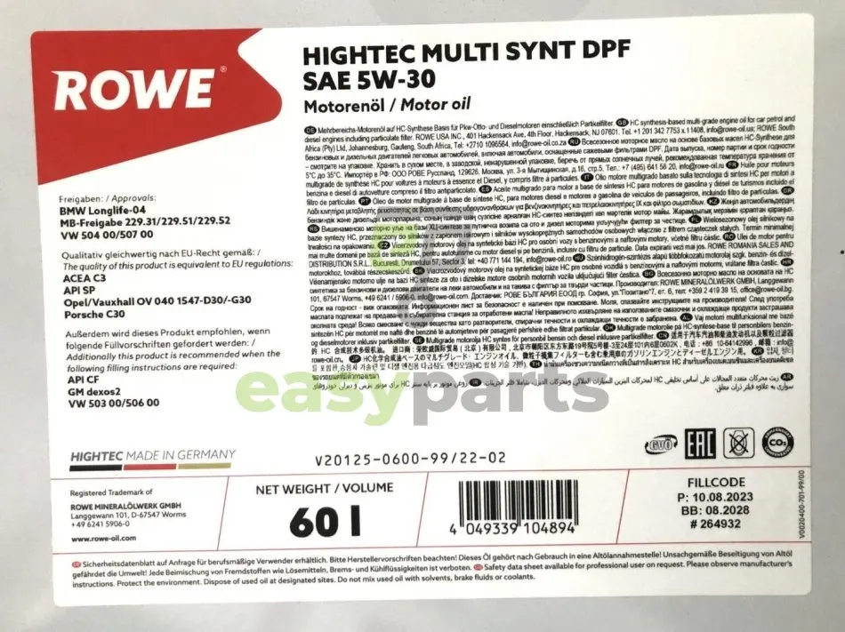 Олива 5W30 HIGHTEC MULTI SYNT DPF (60L) (BMW LL-04/MB229.51/229.31/229.52/VW504 00/507 00/GM dexos2) ROWE 20125-0600-99