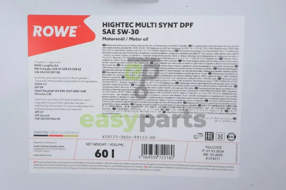 Олива 5W30 HIGHTEC MULTI SYNT DPF (60L) (BMW LL-04/MB229.51/229.31/229.52/VW504 00/507 00/GM dexos2) ROWE 20125-060D-99