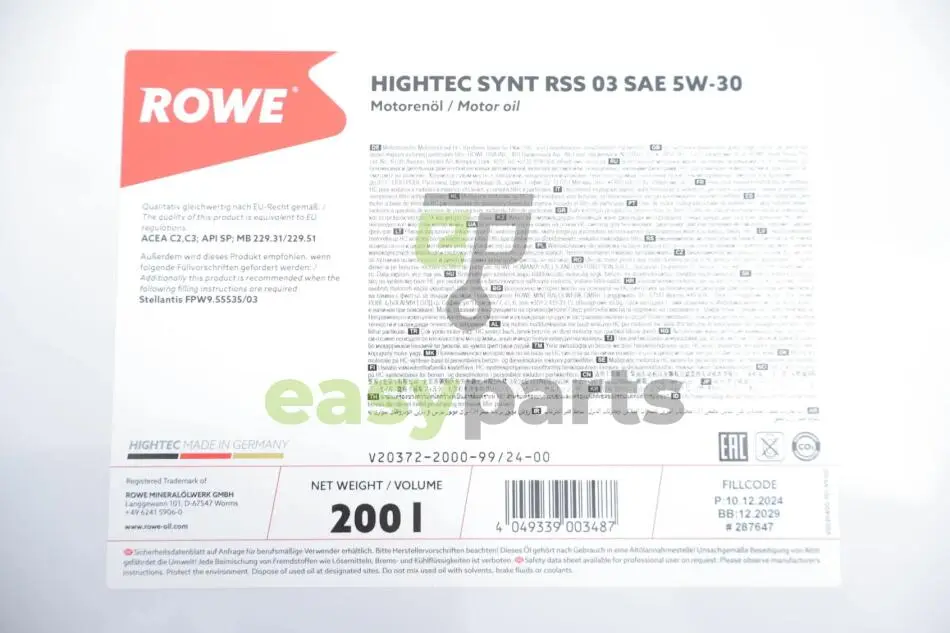 Олива 5W30 HIGHTEC SYNT RSS 03 (200L) (MB 229.31/229.51) (ACEA C2/C3/API SP) ROWE 20372-2000-99