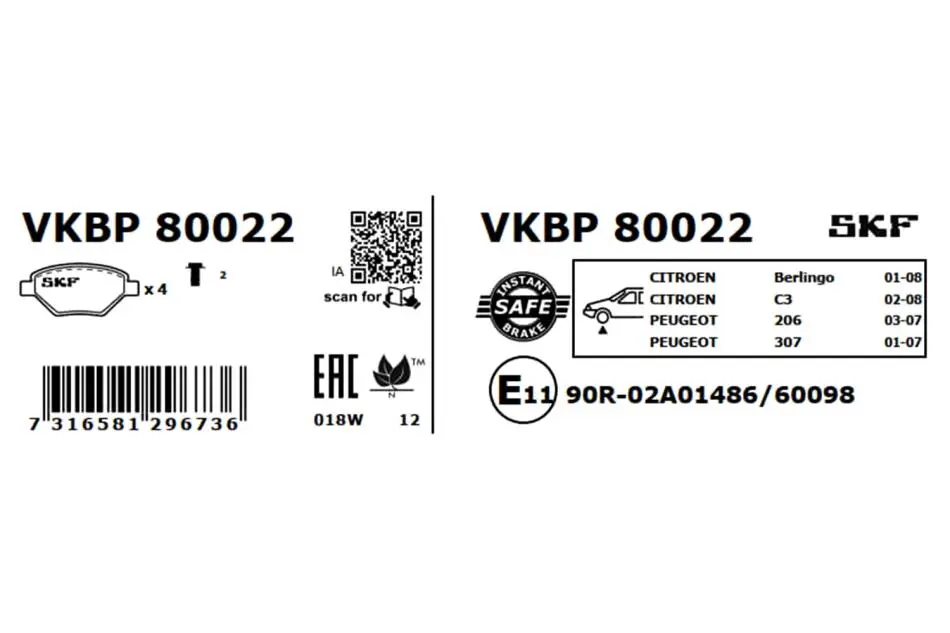 Колодки гальмівні (передні) Citroen Berlingo 00-11/C4 1.6 THP/VTi 04-/Peugeot 207/307 02- (Bosch) SKF (СКФ) VKBP80022